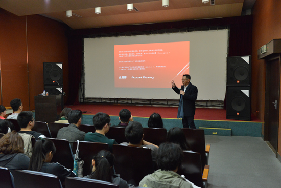 他提到,一个品牌广告从接单→前期调研→创意制作→提案→推广各主要环节,是与各个部门相互合作密不可分的,看似独立运作的部门,其实是彼此密切相关、通力合作的团队。广告公司运营的关键是拥有客户资源并能解决客户的问题,同时具有自我推广的市场运营能力和创意团队的创作能力。他与同学们交流广告提案时讲到,提案是广告公司商业运营中面对客户的重要环节,面对客户提案首先要有自己的风格,需要对提案的内容深度熟悉;其次要有诚意,对周边事物的敏感度和好奇心也很重要。