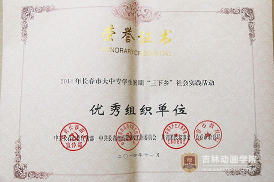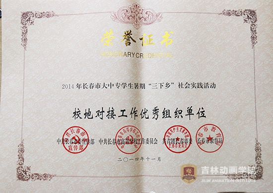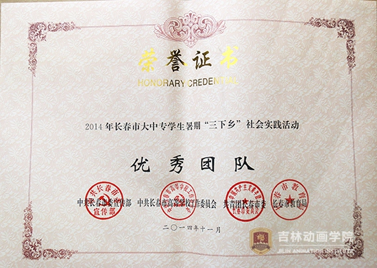 此次表彰我院获得2014年度吉林省大中专学生志愿者暑期“三下乡”社会实践活动暨“百基千队服务万村行动”优秀组织工作奖;动漫分院社会实践小分队、设计分院社会实践小分队分别获得2014年度吉林省大中专学生志愿者暑期“三下乡”社会实践活动暨“百基千队服务万村行动”优秀团队和2014年度吉林省“百基千队服务万村行动”先进团队。刘宝雨、刘博获得2014年度吉林省大中专学生志愿者暑期“三下乡”社会实践活动暨“百基千队服务万村行动”先进个人。学院团委获得2014年长春市大中专学生暑期“三下乡”社会实践活动优秀组织单位和校地对接工作优秀组织单位。设计分院、游戏与数字媒体技术分院、传媒分院社会、影视戏剧分院、广告分院、文化产业管理分院组织的社会实践小分队获得了2014年度长春市大中专学生暑期“三下乡”社会实践活动优秀团队。孙强、孙健获得2014年长春市大中专学生暑期“三下乡”社会实践活动优秀指导教师奖;周毅、王春龙、闫卫东、李昊然、闻佐宬5名学生获得了2014长春市大中专学生暑期“三下乡”社会实践活动先进个人奖。李萌田、任宪亮、张金铭、宋英男、李佳芮、杨茉6名学生获得了2014年长春市大中专学生暑期“三下乡”社会实践活动优秀随笔。