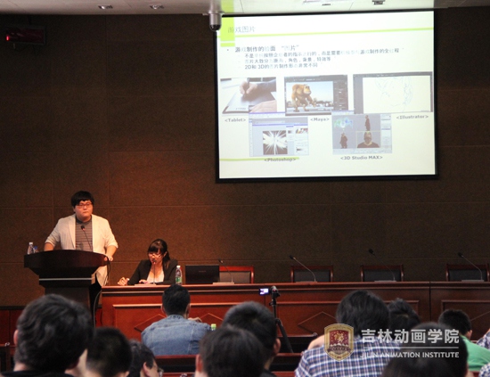 卢海仙博士的报告题目是“游戏制作过程及团队”,详细介绍了游戏的企划、图片、程序、音乐等组成部分。为了更好的使学生了解部分重要内容,通过采取生动有趣的比喻,赢得了学生们一阵阵的笑声。并分享游戏制作的心得,认为“在游戏制作过程中没有所谓的理所应当,希望学生们打开想象的翅膀,应用到游戏制作中”。