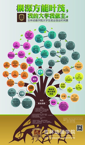 时光荏苒,金秋九月。我们迎来了新同学,同时又有一批同学面临毕业。我们设计了这样一棵“四年规划之树”,目的是让大四同学有一个明确的“就业时间表”,及早为就业做准备。但我们更加希望通过这样一棵树启发更多年级的学生:只有把根深深地扎在泥土里,努力吸收更多丰富的养分,才能让自己的人生之树枝繁叶茂,硕果累累。