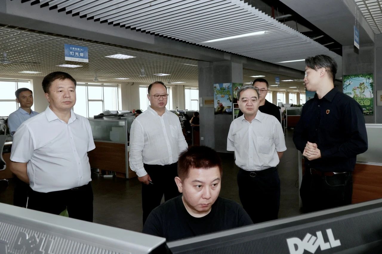在参观学校实践教学平台和学研产一体化创作成果展厅过程中,调研组实地考察了《山海之战》《新卖火柴的小女孩之芙蕾雅》《传说之影》等动画电影、CG电影的制作过程,并与主创人员进行亲切交流。苟人民询问了实践基地创作团队、学生实践团队建设、生产流程系统及软件开发情况,对我校师生原创系列动画大电影《青蛙王国》《疯狂电脑城》等影视作品的创意与制作成果表示赞赏,对于学校在自有知识产权的软著和专利技术取得的成果表示认可。