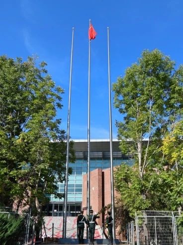 早晨八点,伴随着激昂的旋律,国旗护卫队迈着坚定的步伐引领着校旗护卫队、刀旗队、花束方队、女子持枪连方队、男子劈枪连方队以及由各学院运动员代表队、教工代表队、吉林吉动文化艺术集团代表队组成的11支方队依次走过主席台,接受大会检阅。在雄壮的国歌声中,五星红旗冉冉升起、高高飘扬。