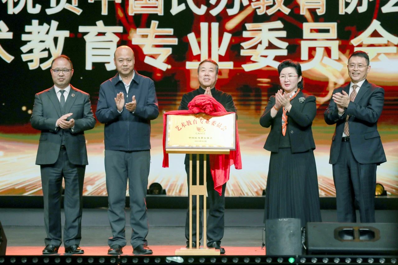 刘林、胡仁友、秦和、刘立国、郑立国共同为中国民办教育协会艺术教育专业委员会揭牌。