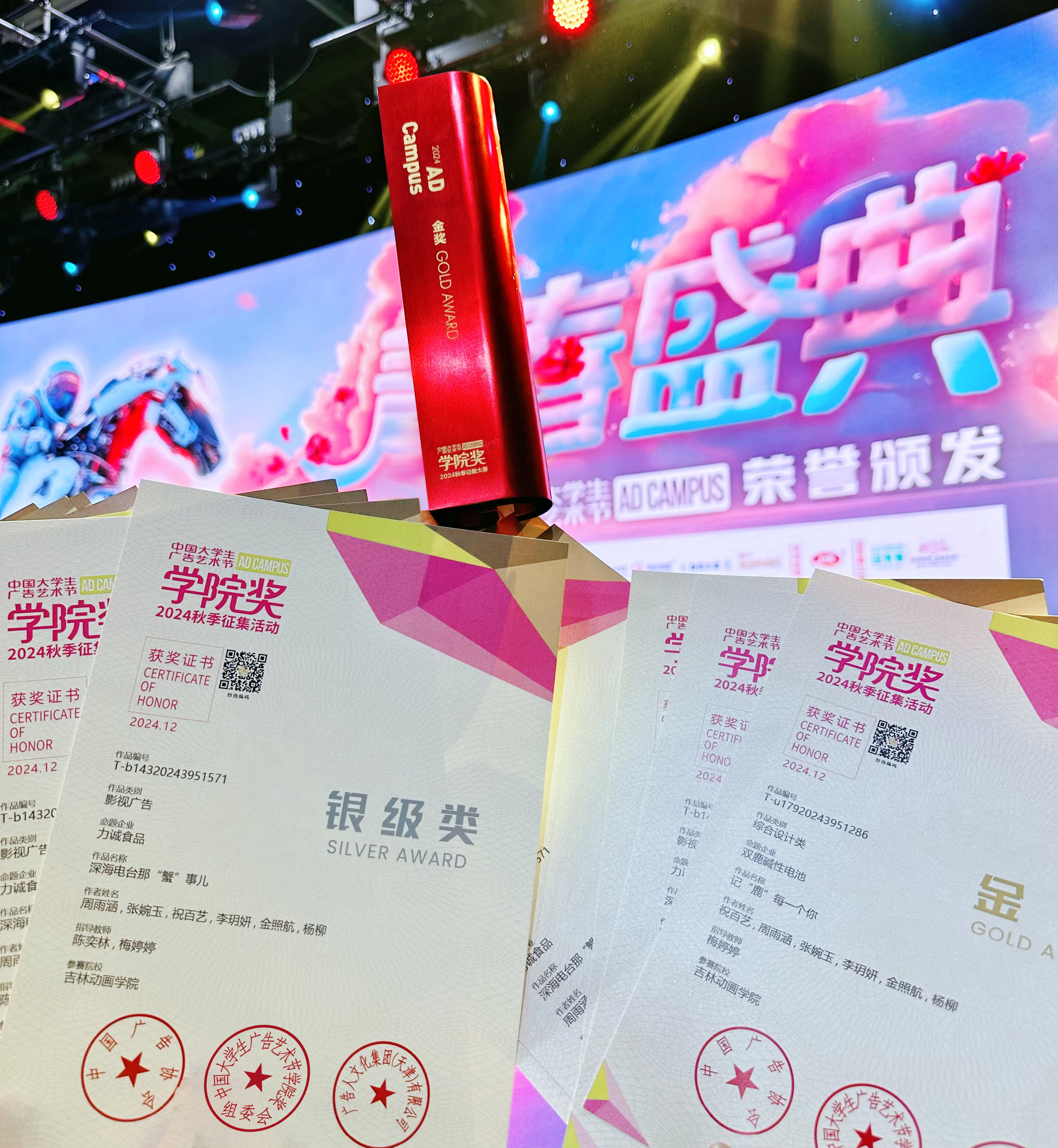 近日,在中国大学生广告艺术节学院奖2024秋季赛颁奖典礼上,我校选送的作品荣获双鹿电池综合设计金奖与力诚食品影视广告银奖两项大奖。获奖作品由我校设计与产品学院祝百艺、周雨涵、张婉玉、李玥妍、金照航、杨柳同学组成的设计小组完成,奖项的获得充分体现了我校学生在广告创意领域的专业素养与实践能力。