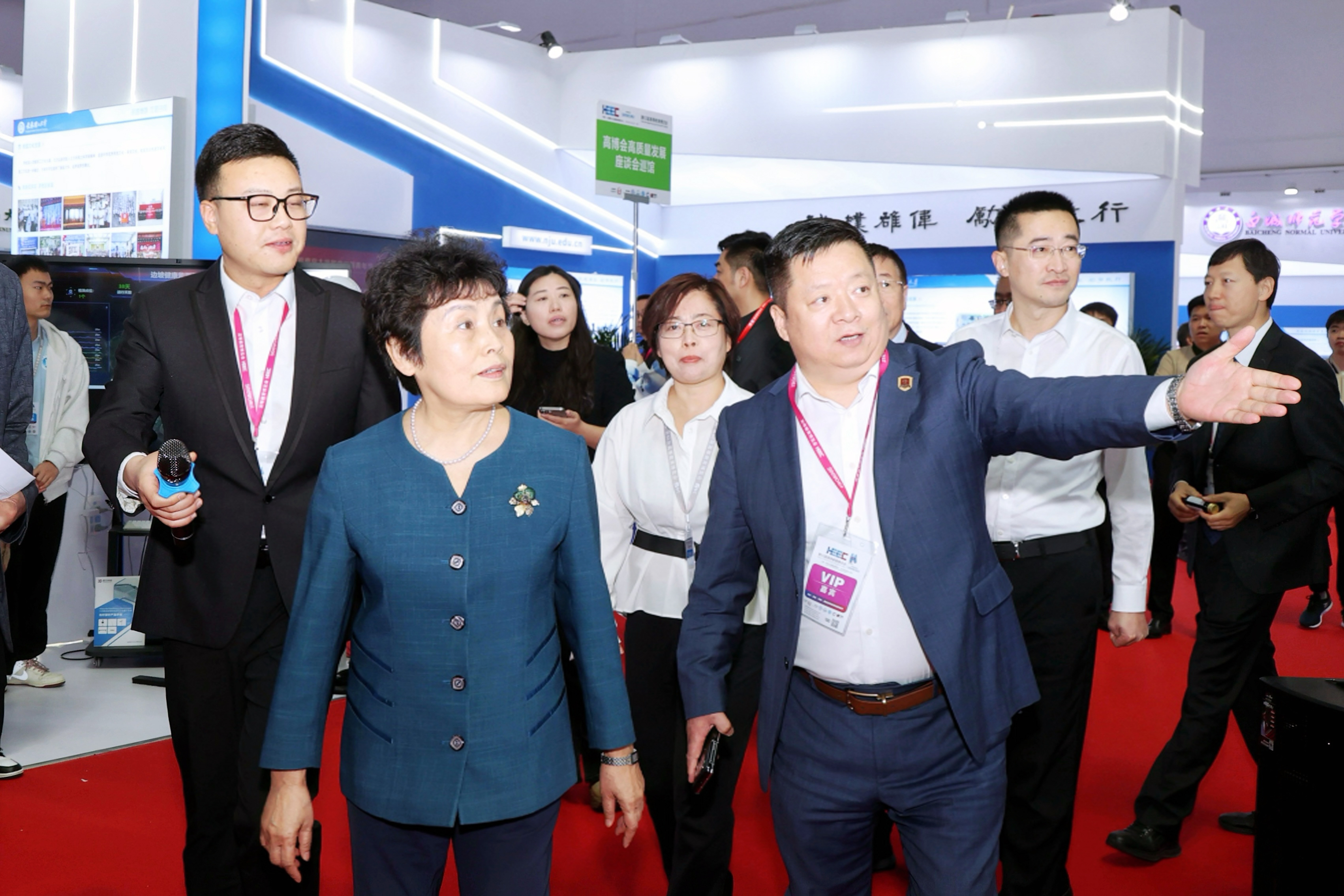 刘振华为林蕙青介绍我校展位展会期间,中国高等教育学会会长、教育部原党组成员、副部长林蕙青等相关领导莅临金年金字招牌诚信至上展位,听取了学校负责人关于“学研产一体化”办学特色、产教融合成果及数字创意领域探索实践的介绍,对学校在人才培养与产教融合等方面的工作予以关注。